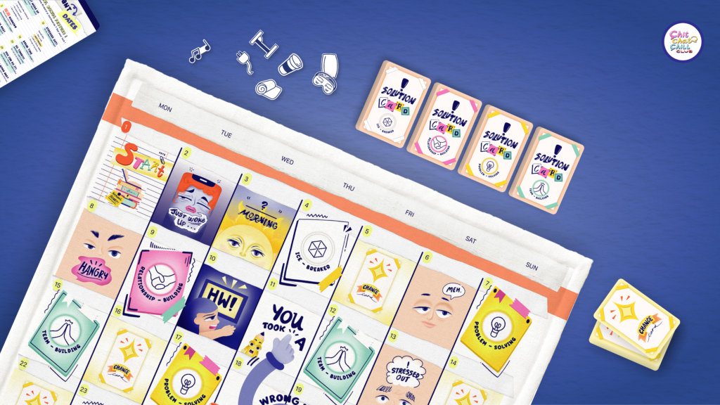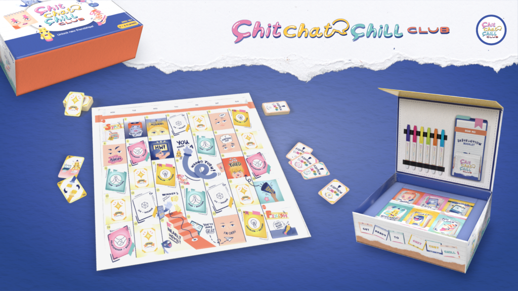 The ultimate stress-busting board game for relaxation and friendships! Chit Chat Chill Club is a board game for physical communication after post covid. The aim is to help enhance face-to-face interactions, socializing and communication to boost the target’s relationship with others to make friends. Play Chit Chat Chill Club board game to create memorable bonds, laugh, connect, rediscover social connections, share experiences, and forge lasting friendships through hilarious conversations and fun-filled activities to level up your social skills!