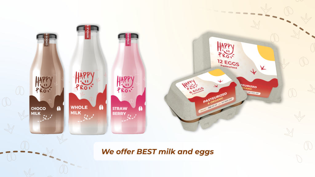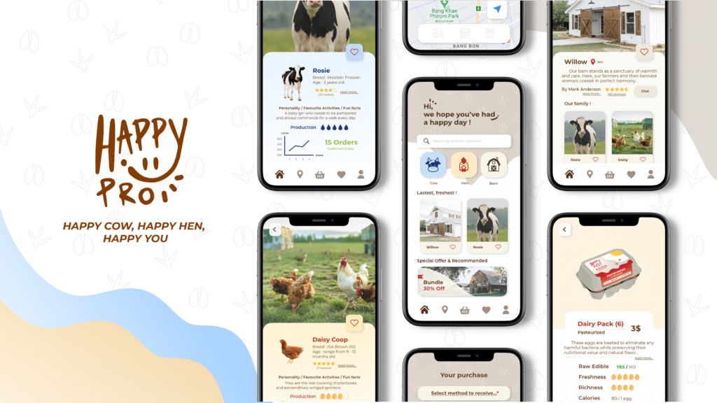 “”Happy Pro” is established with the purpose of providing Gen Z with access to fresh and high-quality dairy organic products. These products are sourced exclusively from happy livestock, which are meticulously cared for and provided with exceptional living conditions and quality of life by local farmers in various rural areas. This initiative aims to bolster local economies and enhance the value of locally produced goods, thus expanding the Thai organic market. New technologies, such as applications, are used to represent the brand’s and product’s value effectively.